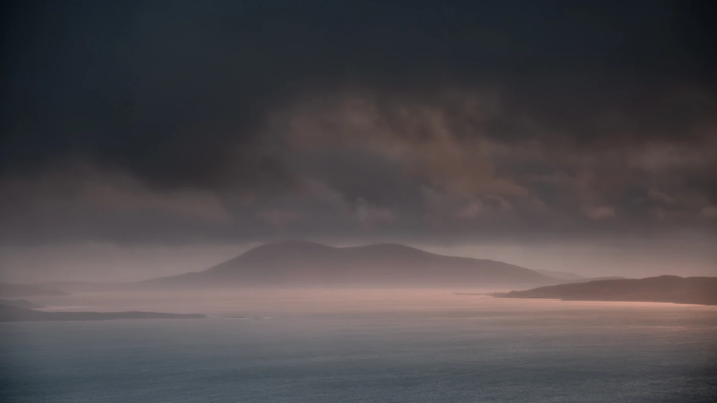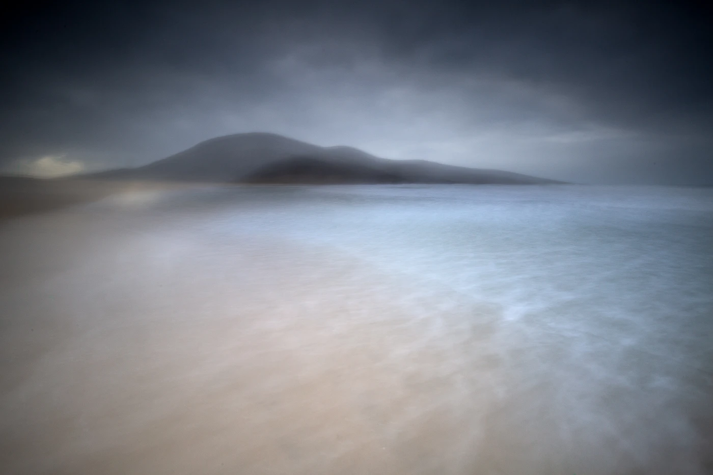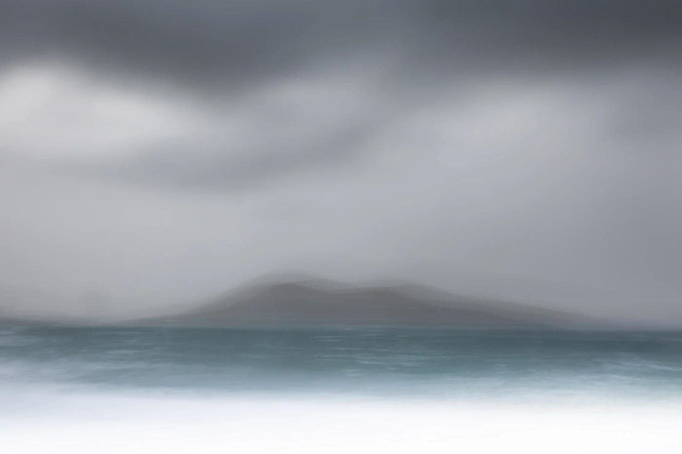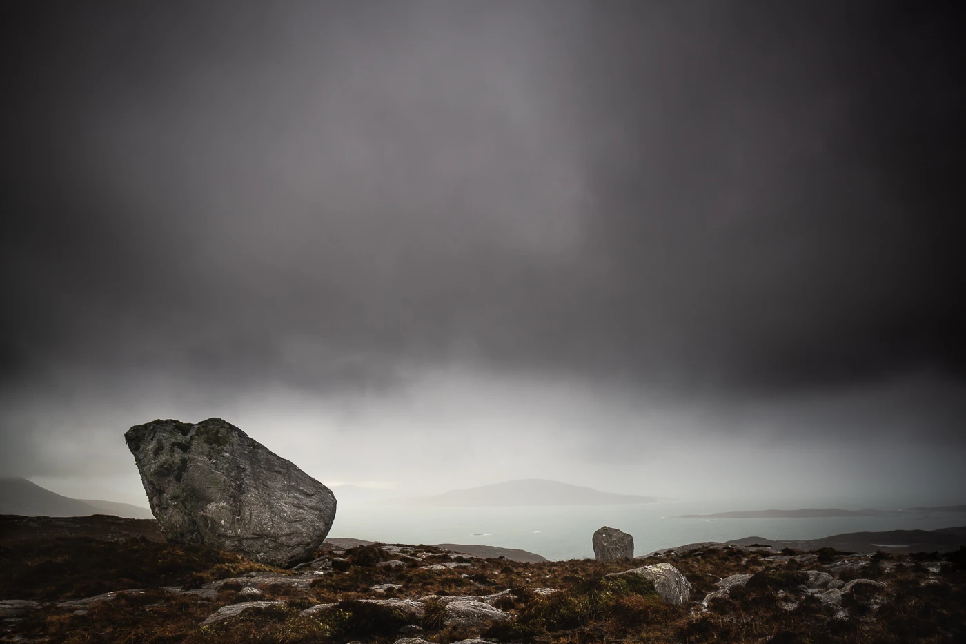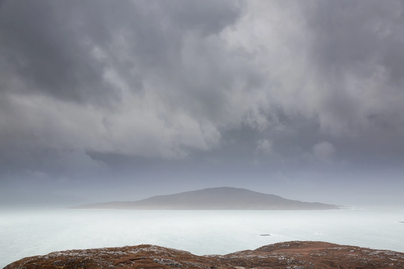 Nous avons vu les nuages danser à nos pieds dans l’eau limpide des grandes baies. Nous avons vu les voiles de la Chailleach surgir de l’océan atlantique pour engloutir les Uibhists. Nous avons vu les chevaux blancs de Manannan Mac Lir galloper vers le rivage et nous avons vu la lutte incessante entre lumière et obscurité.