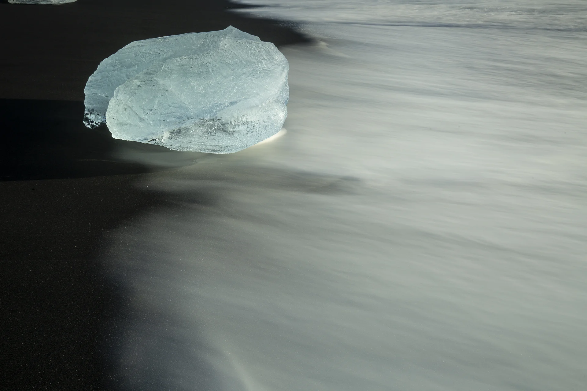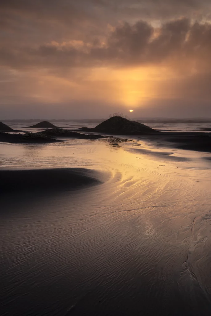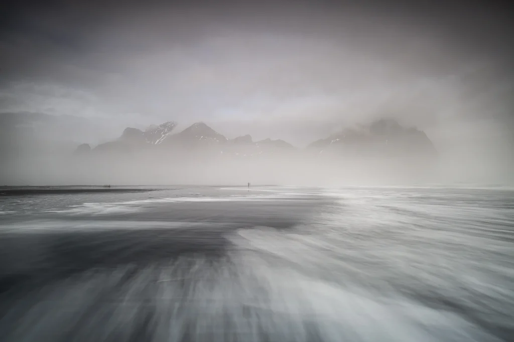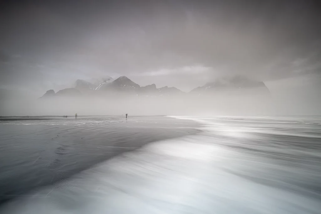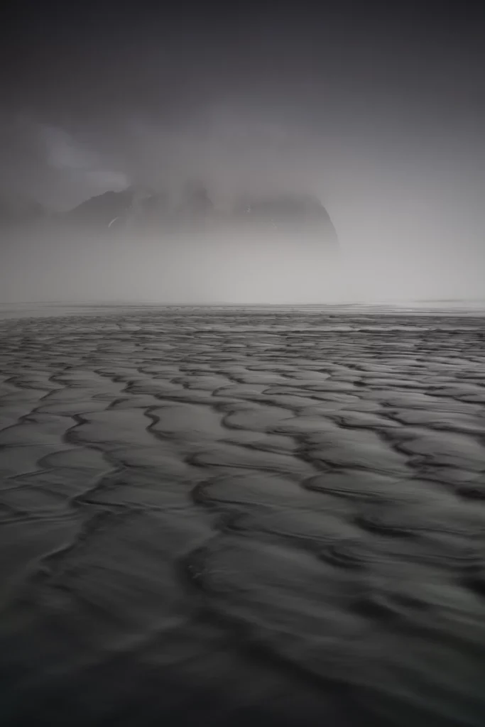 Pas un souffle de vent alors que nous suivons notre chemin silencieux dans le sable sombre. Les vagues chuchotent dans un brouillard cotonneux. On marche entre rêve et réalité.
