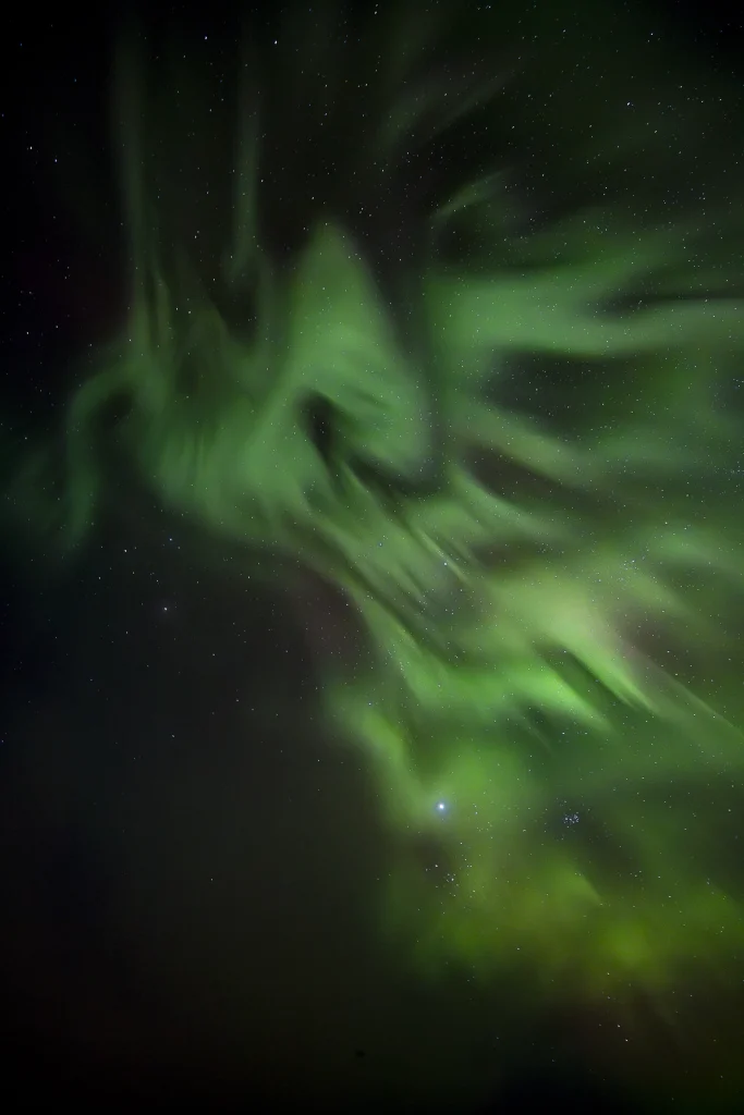 Comme chaque année, nous avons eu le privilège d’assister à la magie des lumières qui dansent dans le ciel boréal. Certains disent que ces lumières sont les reflets de l’armure des Valkyries, d’autres que le renard de feu soulève la neige faisant des grandes vagues lumineuses qui traversent le ciel. Sandrine partage souvent un conte de femme-renard où les aurores s’invitent… C’est toujours un moment de magie intense quand l’aurore s’emballe, que ce soit dans le ciel ou dans un conte. Je crois que je ne m’y habituerai jamais.