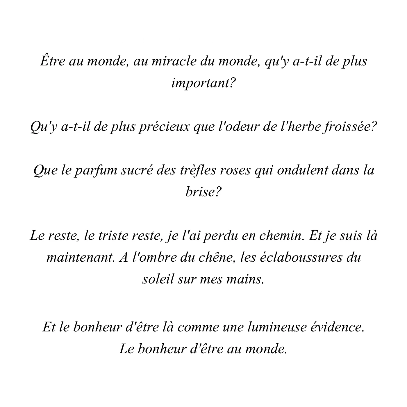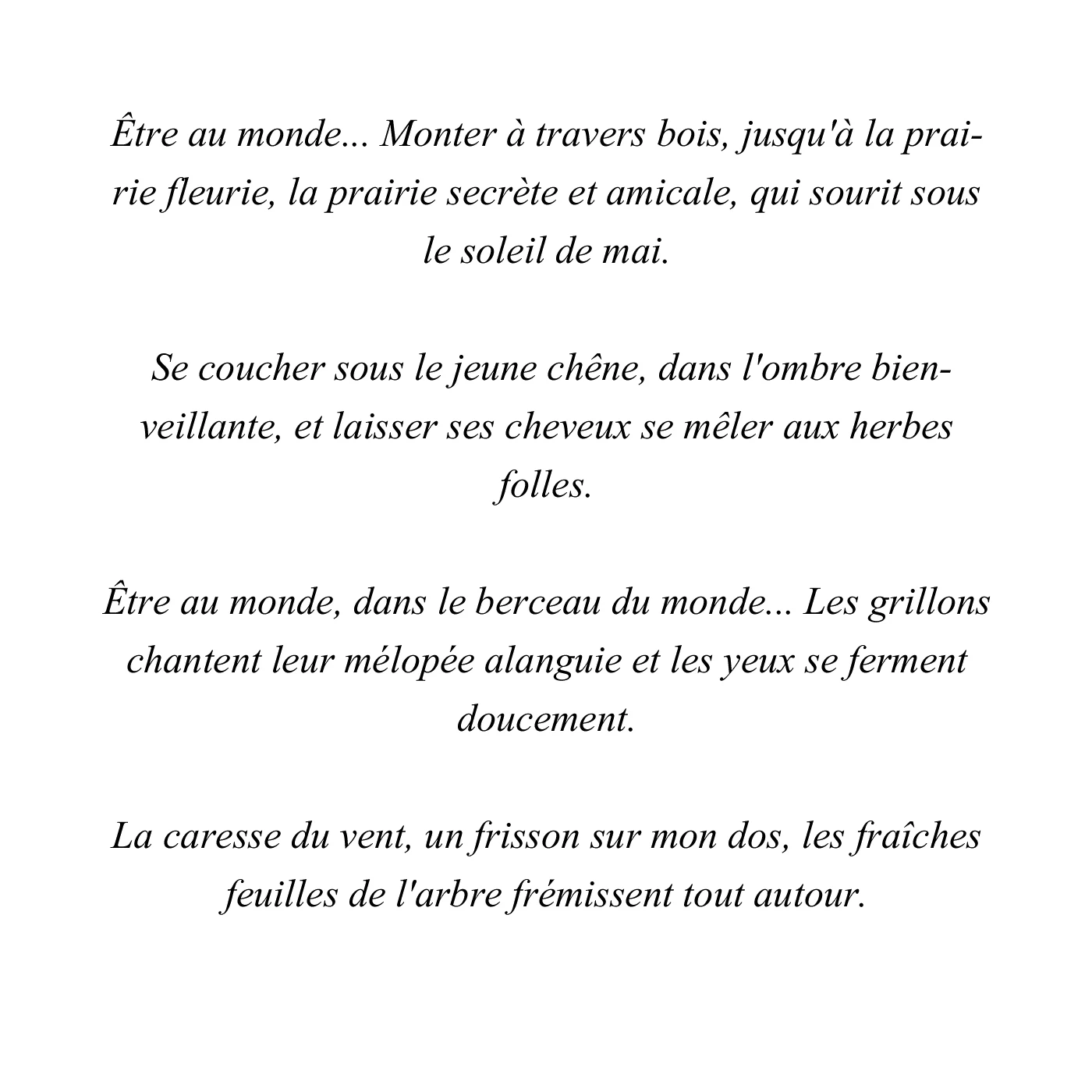 Des images inspirées des tableaux impressionnistes pour dire la poésie de la vie. Des sensations fugaces comme des frissons, des instants fragiles qu’on attrape au vol et dont on savoure la résonance en fermant les yeux. Nos impressions d’hiver racontent la douceur des flocons, le velours des ciels feutrés, les marches silencieuses dans le désert blanc des plateaux. Les impressions colorées chantent la joie du soleil revenu, l’odeur sucrée de l’été, le tableau des prairies pétillantes de fleurs. Elles se font soupirs à l’automne mélancolique, dans le froissement léger de chaque feuille qui tombe. De toutes petites choses, mais belles infiniment, à saisir au fil des saisons.